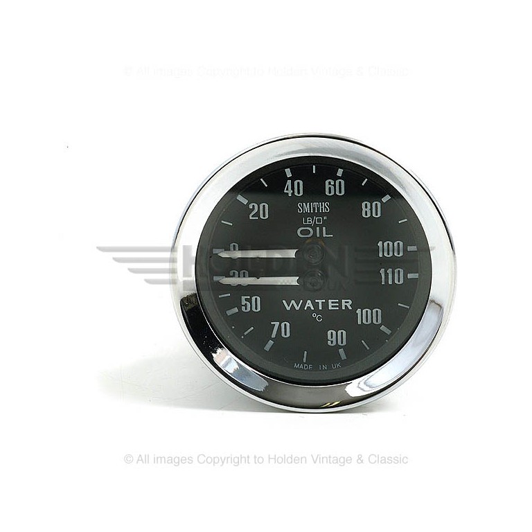Genuine SMITHS designed instrument, skillfully crafted to the original drawings and specifications, using the original tools and dies. This one is 52 mm diameter with 1/2V chrome bezel with white figures on a black dial. Oil pressure from 0 to 100 lbs per square inch and water temperature from 30 to 110 degrees C. 1980 mm capillary fitted as standard. Water temperature bulb is 5/8 UNF male. A suitable pressure pipe and fittings for oil pressure will need to be purchased separately if required. Supplied with bulb holder and bulb, together with the necessary mounting clamp.