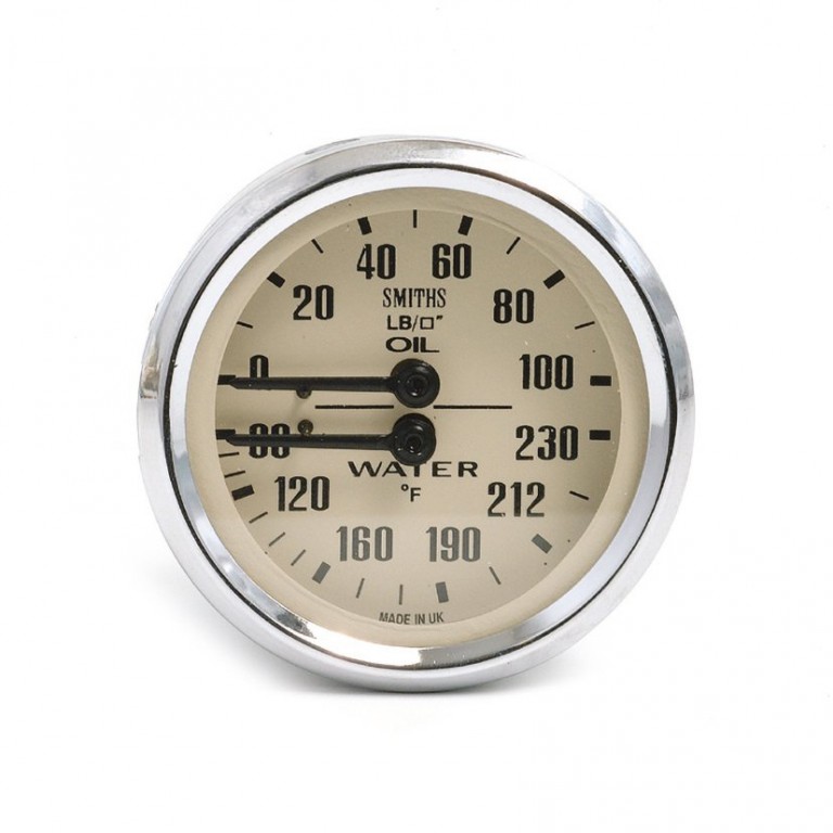 Genuine SMITHS designed instrument, skillfully crafted to the original drawings and specifications, using the original tools and dies. This one is 52 mm diameter with full V chrome bezel with black figures on a magnolia dial. Oil pressure from 0 to 60 lbs per square inch and water temperature from 90 to 230 degrees F. 1980 mm capillary fitted as standard. Water temperature bulb is 5/8 UNF male. A suitable pressure pipe and fittings for oil pressure will need to be purchased separately if required. Supplied with bulb holder and bulb, together with the necessary mounting clamp.
