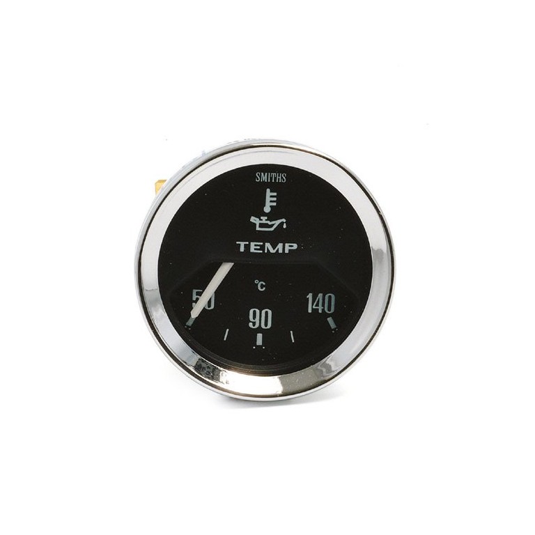 Genuine SMITHS designed instrument, skillfully crafted to the original drawings and specifications, using the original tools and dies. This one is 52 mm diameter with 1/2V chrome bezel, white figures on a black quadrant dial reading from 50 to 140 degrees C. Supplied with bulb holder and bulb, together with the necessary mounting clamp. A corresponding temperature sender will be required, These gauges work on 10 volts and a voltage stabiliser is required (1 per car) The stabiliser is polarity sensitive, so ensure you select the correct one.