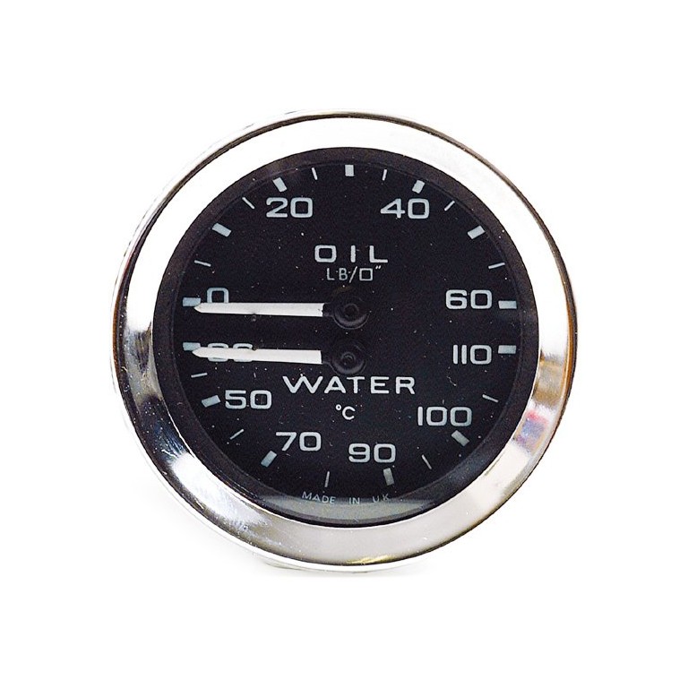 Genuine SMITHS designed instrument, skillfully crafted to the original drawings and specifications, using the original tools and dies. This one is 52 mm diameter with 1/2V chrome bezel with white figures on a black dial. Oil pressure from 0 to 60 lbs per square inch and water temperature from 30 to 110 degrees C. 1980 mm capillary fitted as standard. Water temperature bulb is 5/8 UNF male. A suitable pressure pipe and fittings for oil pressure will need to be purchased separately if required. Supplied with bulb holder and bulb, together with the necessary mounting clamp. This gauge was made specially for cars using the Lotus Twin-Cam engine, which runs at a lower oil pressure than most engines.