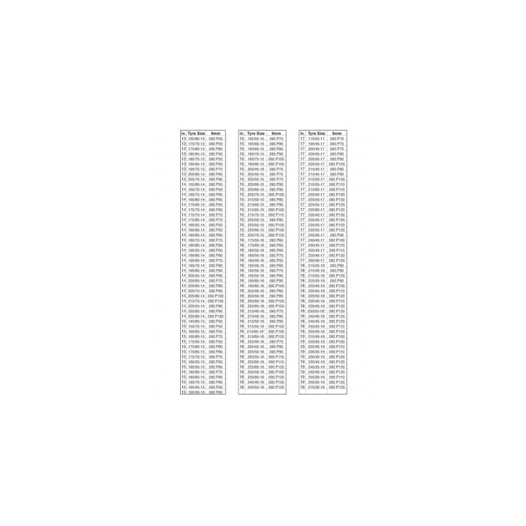 A pair of quick fitting diamond pattern chains to give you traction on snow, manufactured using mild steel with spring assisted tensioning system. 9mm projection for limited clearance applications. Includes gloves, one pair per pack, repair links and fitting instructions. Available for a large range of wheel/tyre sizes, each size fits particular wheel/tyre sizes, select size from chart below. Enter this number in the search box at top right to obtain full details of that size