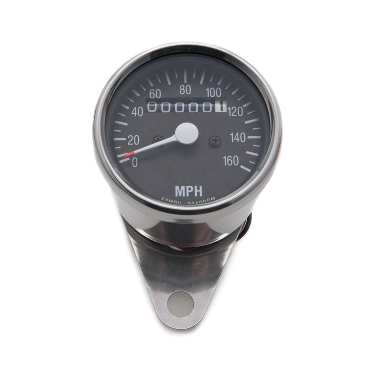 Black dial, white numbers and chrome rim. Reads to 160 mph and includes distance recorder