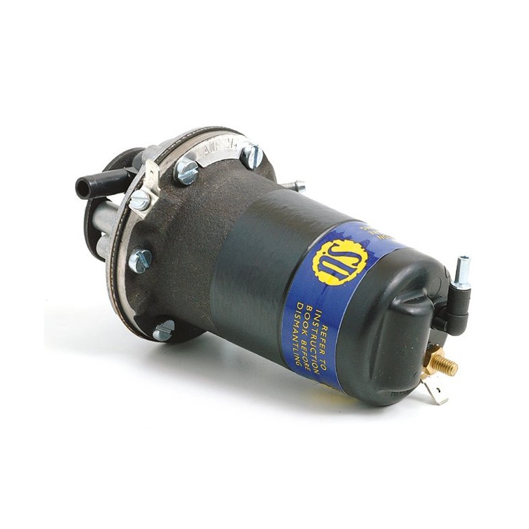 Original type with points. 12 volts. 7 gallons per hour. Ref AUF214. Fitted to Mini, A40, 1100, 1300 Austin Healey Sprite and MG Midget. This is very much the basic SU pump - it is supplied with plastic unions on the rear to take 1/4 inch push-on hose and is designed to sit in a saddle clamp, so has no form of bolt fixings. Should you require, solid state electronic versions are available, these are polarity sensitive.
