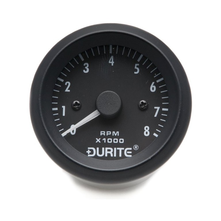 A 52 mm diameter 12 volt Tachometer with white graphics on a black dial and with a black rim. Switchable for 4, 6 or 8 cylinder engines. Wiring: Red to 12 volt supply, Green to CB on coil, Orange to panel lighting and Blacks to earth. Negative Earth only