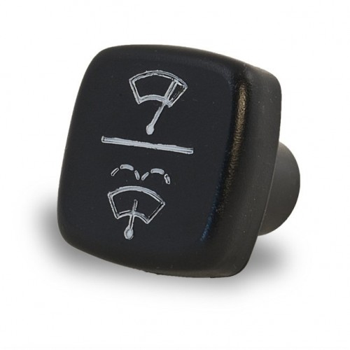 Square Black Knob, with a Wiper / Washer symbol as shown. As fitted to the TR6 European Spec from CR1 on and USA from CF1 on.. This knob is designed to fit to a switch with a hexagonal shaft. We keep a range of knobs of the type fitted to the TR6, available both individually, or as a set