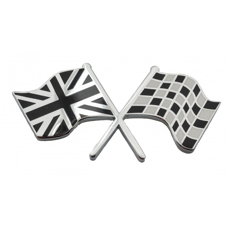 A metal enamelled badge with an adhesive backing showing a union flag and a chequered flag crossed. Width 50mm
