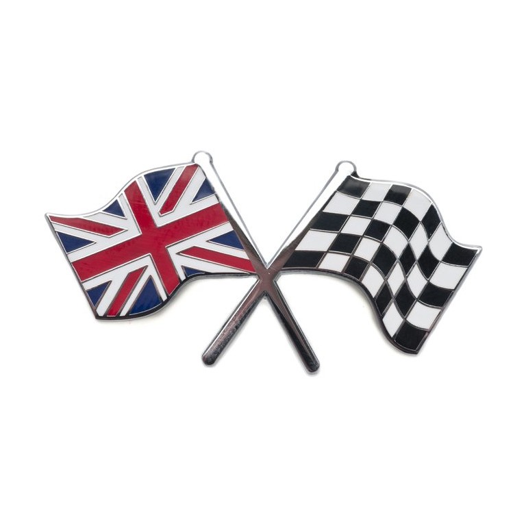 A metal enamelled badge with an adhesive backing showing a union flag and a chequered flag crossed. Width 50mm
