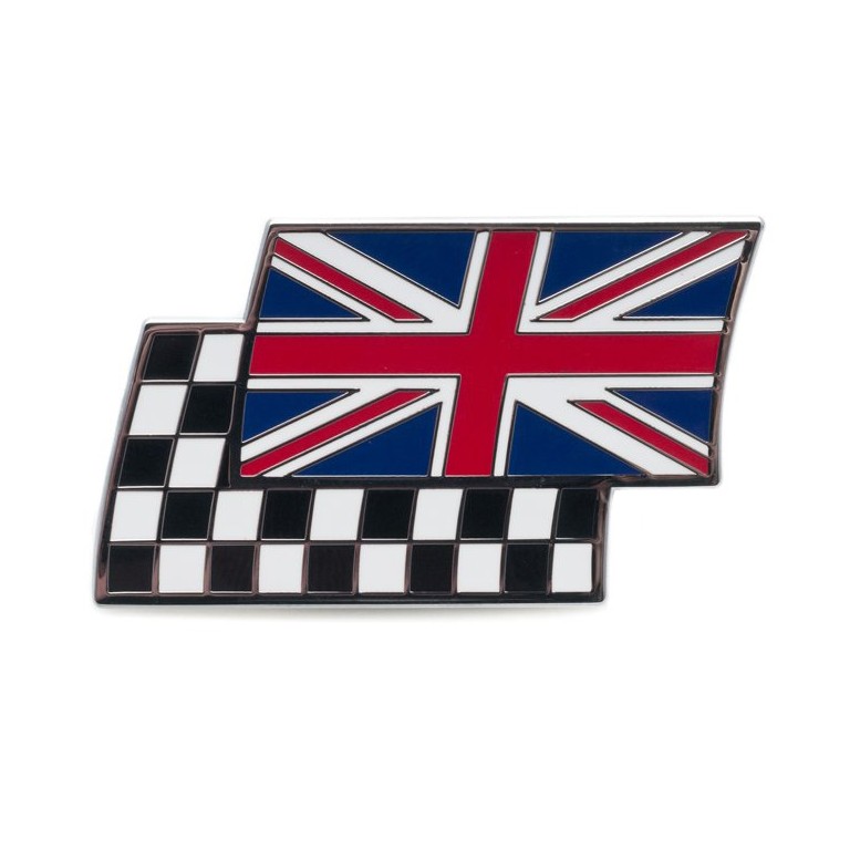 A metal enamelled badge with an adhesive backing showing a chequered flag overlaid with a union flag