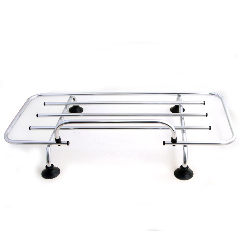 Made from aluminium. It sits on four rubber feet on the boot lid and is retained on the edge of the lid by adjustable clamps. Alternatively, the four feet are tapped M6 and it would be possible to bolt through your boot lid into the feet to secure the rack permanently. The platform size is 880 mm wide and 375 mm deep. Will fit across boot lids from 690 to 1390 mm wide and at least 515 mm from front to back MADE TO ORDER 3-6 WEEKS