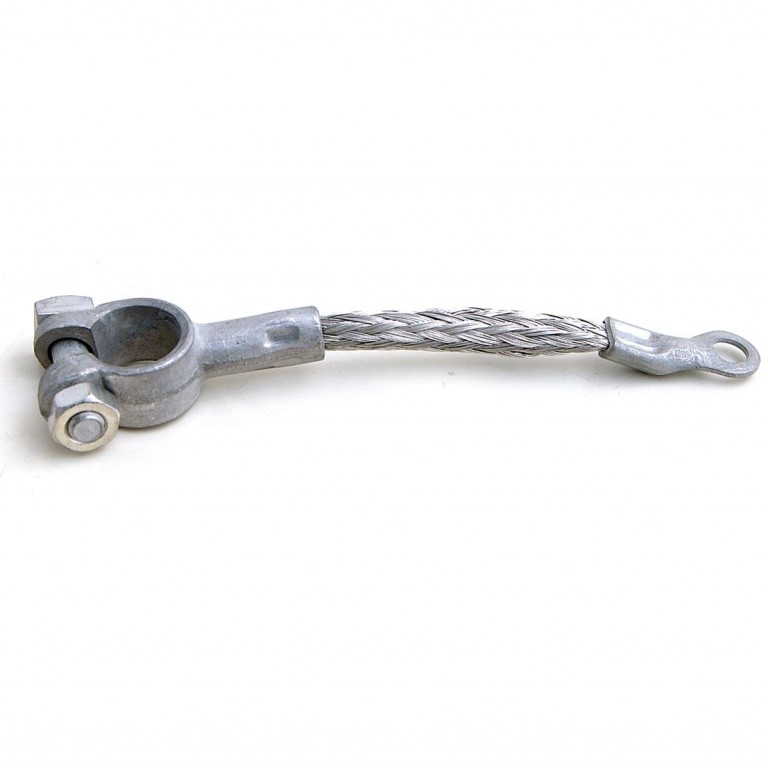 One end has a battery clamp suitable for either positive or negative battery terminals, the other end has an 10mm diameter eyelet. The cable has a round cross-section 32 x 16 strands of 0.3mm tinned copper capable of carrying 130 amps. Length is 525mm. For other earthing cables refer to 080.353 to 080.358.