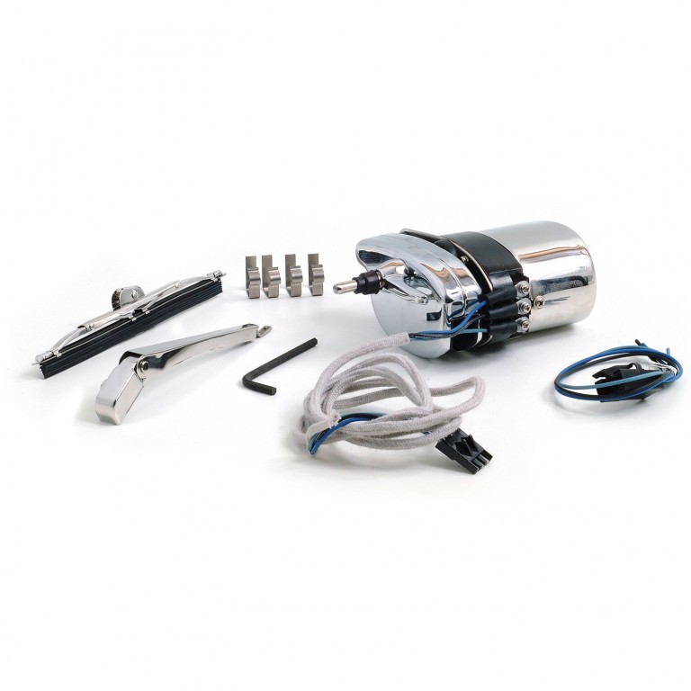 A beautifully made and chrome plated Quick Mount Wiper Motor for those of you who don't want to drill your screen frame. It clamps over the top of your screen and has a quick release electrical connection for 12 volt. (If you want to put up your hood you may have to arrange it around the Motor). This wiper motor has a 90' sweep. Only really suitable for open top cars! A spare wiper arm and blade are available separately.